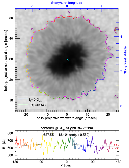During the sunspot’s stable phase, the authors found that the commonly used intensity contour marking the sunspot boundary closely coincides with a contour of constant magnetic field strength of about 625 Gauss. This value corresponds to the equipartition field, where the energy densities of the magnetic fields and convective motions are equal. The results demonstrate that the outer boundary of stable sunspots is a physically meaningful magnetic threshold separating magnetically dominated plasma from normal solar granulation.