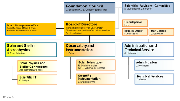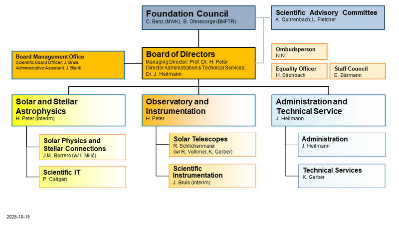 The Institute is divided into two scientific departments: "Solar and Stellar Astrophysics" and "Observatory and Instrumentation." A third administrative-technical department combines the cross-sectional groups of administration and technical service. Project groups reporting to the Board of Directors are formed on demand.